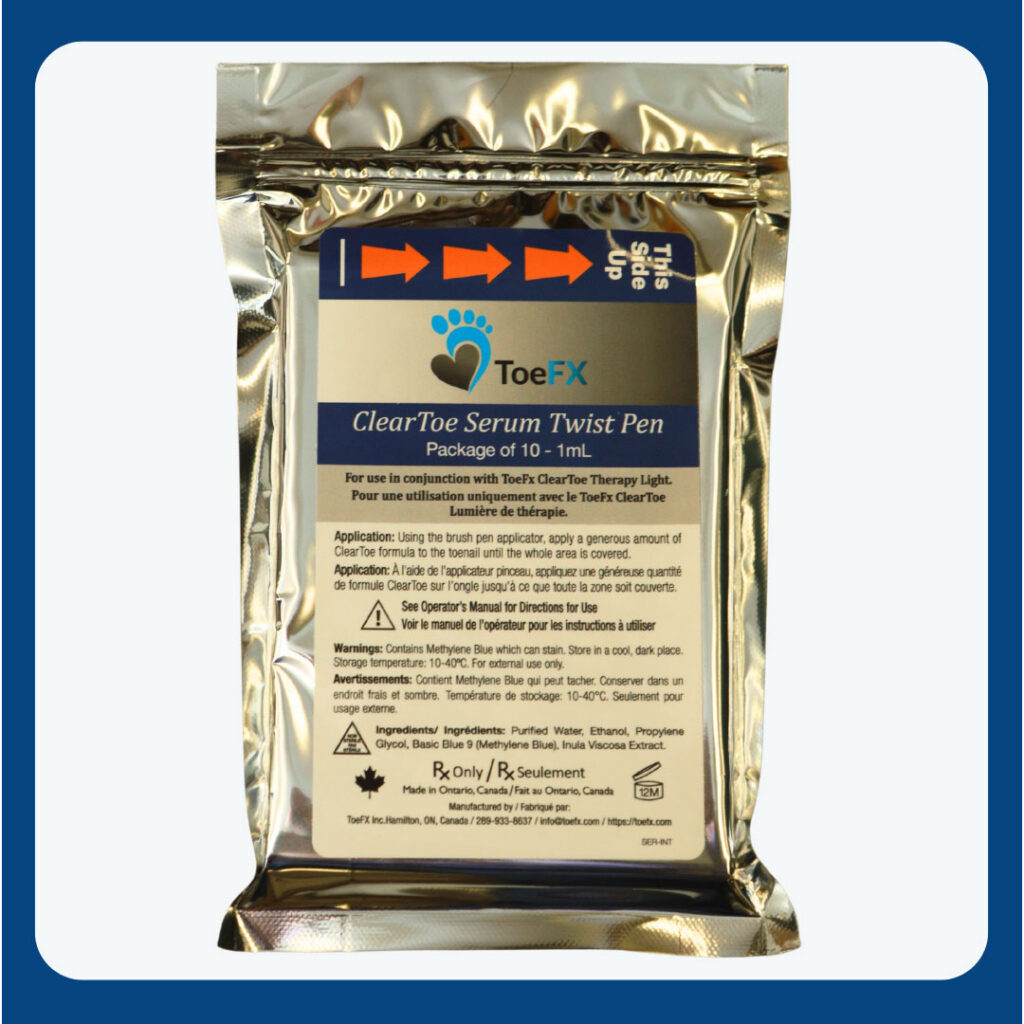 A safe, non-toxic solution designed exclusively for use with the ToeFX Therapy Lights. Each package contains 10 single-use, disposable applicator pens, ensuring precise, hygienic application every time. With most patients requiring 6 to 10 sessions for a complete treatment course, one package typically covers a full course for one patient.