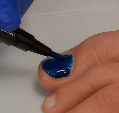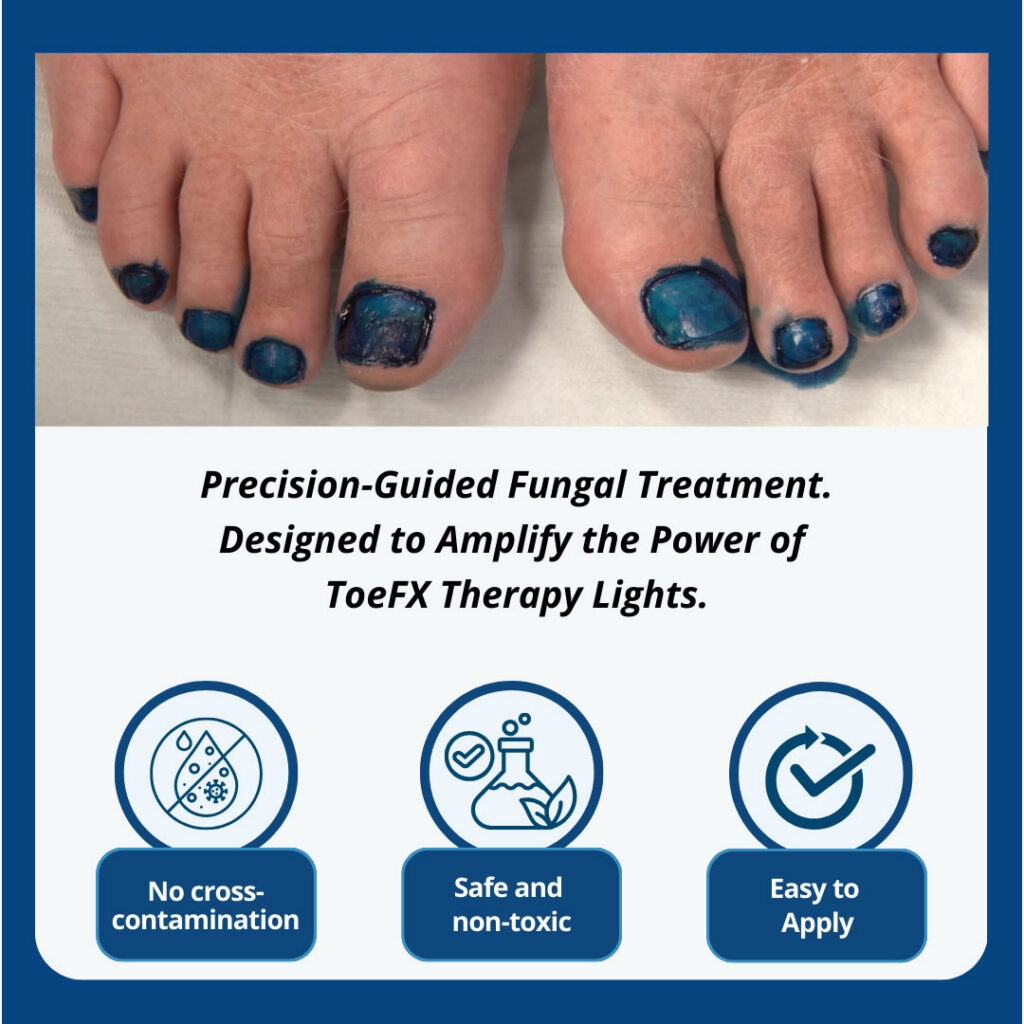 Toe Stain is a safe, non-toxic diagnostic serum developed exclusively for use with ToeFX Therapy Lights. It helps visualize fungal involvement on the nail and surrounding skin, allowing clinicians to target treatment more precisely.