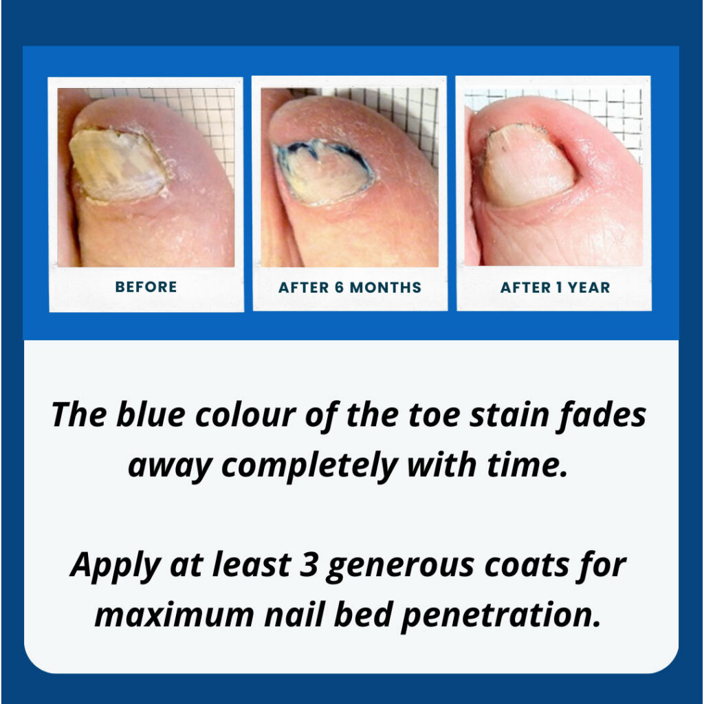 The formula will stain clothing and surfaces. Apply with care and always use gloves. The dark blue colour is normal and will fade away – don’t under-apply. You want full saturation to ensure the light therapy reaches deep into the keratin layers where the fungus lives.