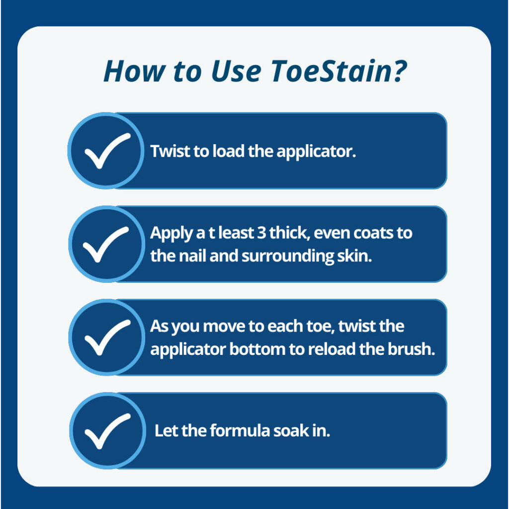 Each applicator pen has a brush tip. Simply twist the bottom until the blue formula appears. Apply a generous coat to the nail and surrounding skin. For best results, apply at least 3 coats to ensure deep saturation.
